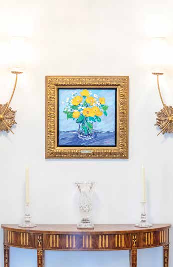 Walls are a soft vanilla throughout. Woodwork, including crown moldings, is finished in light-reflecting semi-gloss. Paintings hang singly rather than in groups, creating drama. Windows are shaded by white venetian blinds, never drapes.