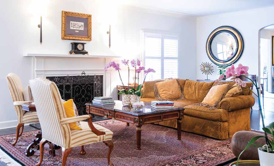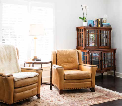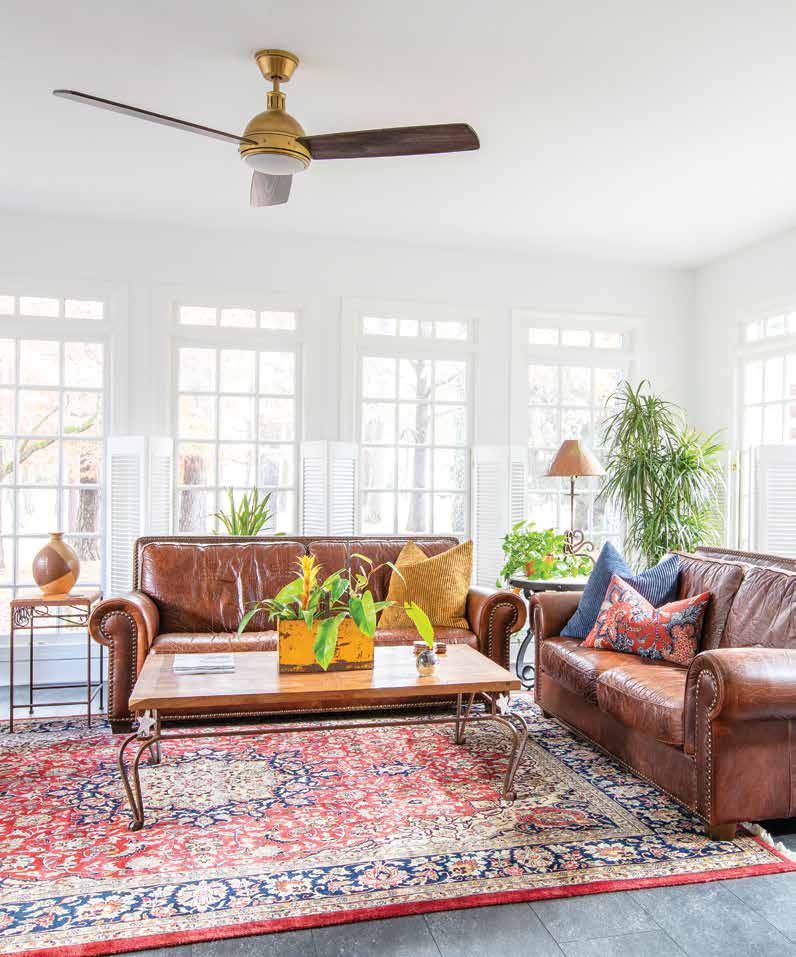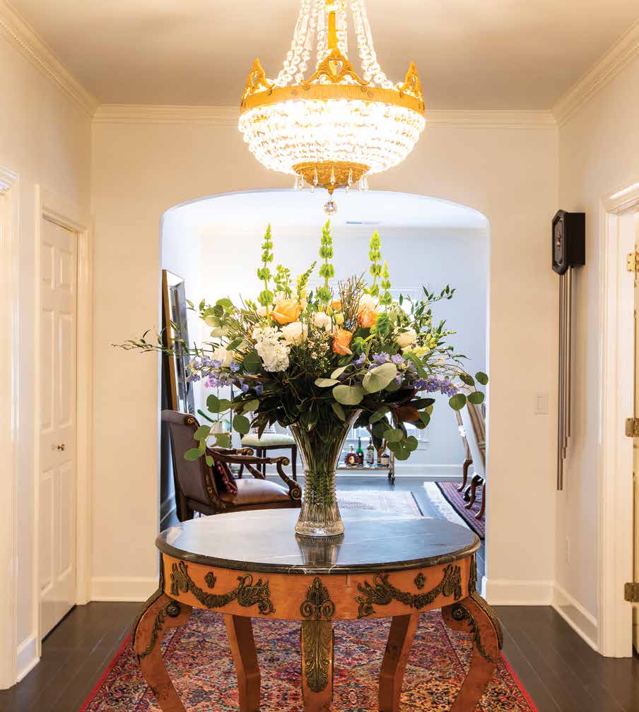 Cynthia chose an interesting black-coffee hue for the engineered flooring, an ideal background for light-colored area rugs. The sparsely furnished two-part living room and oversized Carolina room illustrate a concept originating in the foyer: space as a décor element. The foyer contains only a table. But what a table it is.