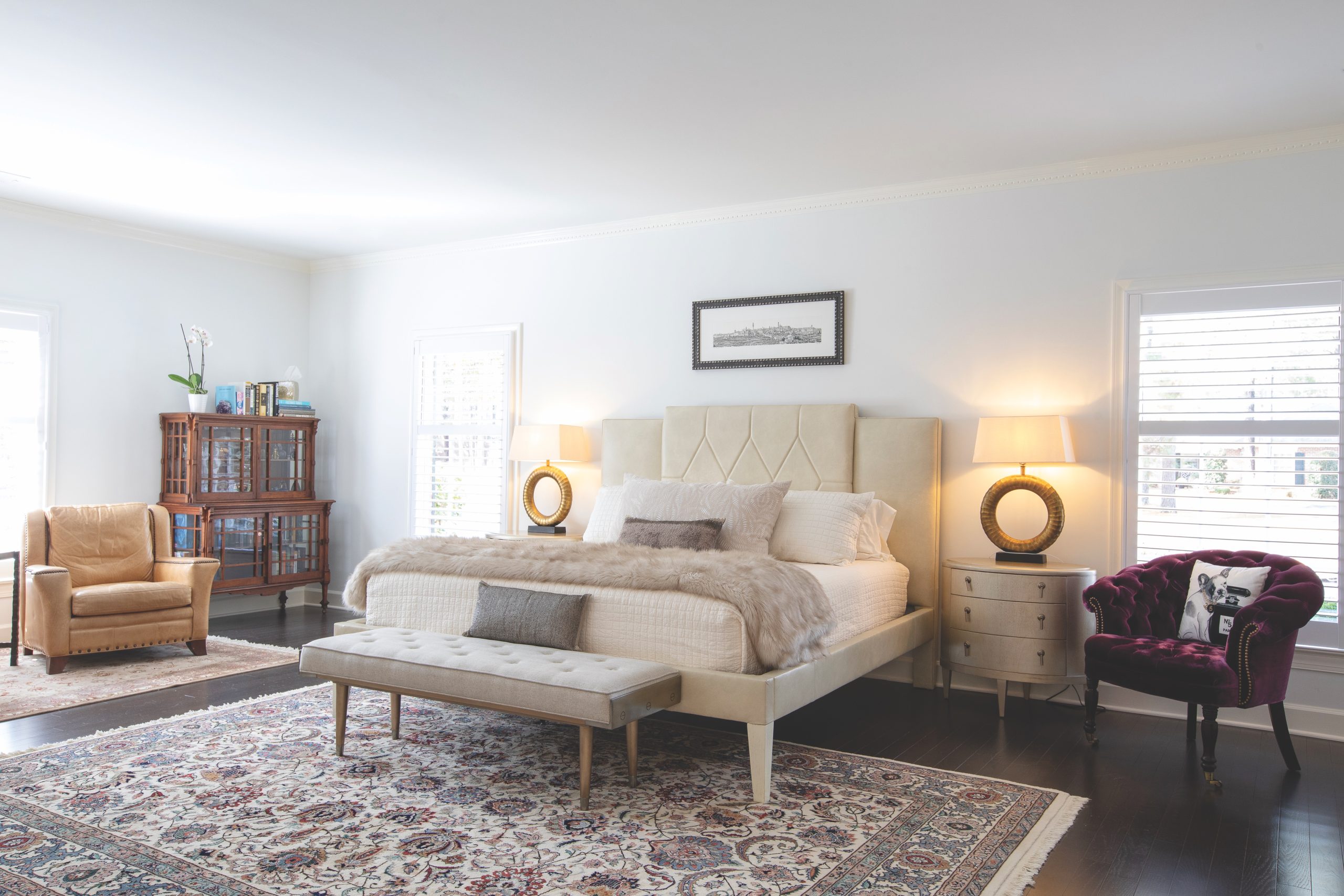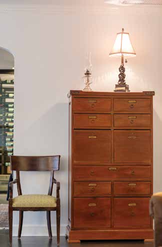 Perhaps the most interesting space is the master suite with seating area, an impressive 18-foot-by-28 foot corner room furnished in custom-made pieces designed by Cynthia. Their shapes suggest frill-free Scandinavian modes popular in the early 1950s. In contrast, the showstopper is a cabinet from Bruce’s family that contains Cynthia’s perfume bottle collection.