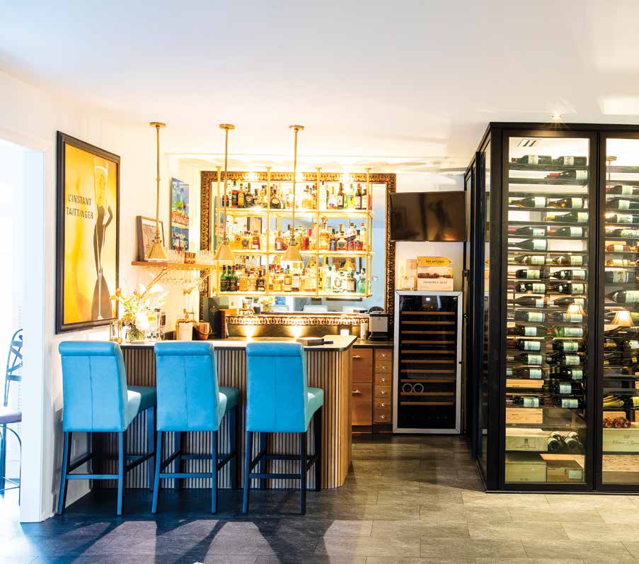 Two bathrooms were gutted. “We had to take out a wall to build a shower in one,” Cynthia says. While designing space for their new lifestyle, Cynthia did not ignore their enthusiasms. “I’m all about wine,” she says. Several temperature-regulated “wine rooms” store and display her collection. Bruce has a coffee station, stockpiles single malt Scotch and keeps a stable of vintage cars and motorbikes. The couple entertains, thus the bar with refrigeration, icemaker and tools to suit a professional bartender. Against an exterior wall they added an adorable, enclosed garden with a wrought iron gate and a variety of surfaces including grass, concrete, pebbles and water where two elderly miniature French bulldogs hang out, weather permitting.