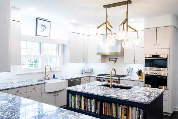Exceptions exist, particularly in the kitchen, where Cynthia had some wall cabinets removed to create a pantry and transformed the island base into shelves for her cookbook collection. A quartz countertop splattered in bright blue adds pop. Meal prep becomes happy time.