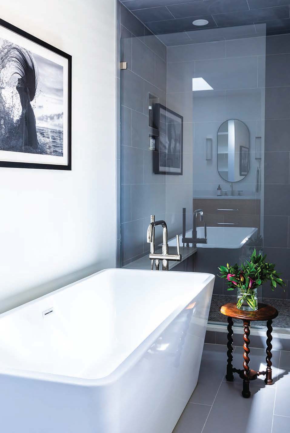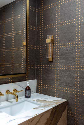 Much thought was given to making spaces flow into one another, including two living/dining screened verandas. With entertaining in mind, Budd created a talk-of-the-town powder room. Squares on a deep brown grasscloth wallpaper are outlined by hundreds of hand-applied metallic rivets. Unusual brass sink fixtures, sconces and a narrow, towering skylight make every visit memorable.