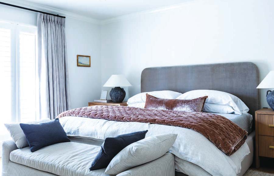 As in the kitchen, built-in storage units dominate an entire wall of the master suite, where an upholstered rectangular headboard illustrates the softened geometrics visible throughout, including a low upholstered bench at the end of the bed, similar to Victorian slipper chairs, where ladies sat while lacing up their tall shoes.
