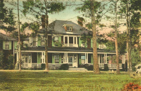 The house’s first period opens with James Boyd’s 1904 purchase of a sizable portion of land on the eastern ridge above downtown Southern Pines. Within months, the matter of building a residence was altered by the death of his kinsman, James Brodnax, who had built a two-story Colonial Revival-style home for himself on the property. James Boyd, grandfather of writer James Boyd and his brother Jackson, enlarged the Brodnax House into an imposing mansion, incorporating building elements dating from the late 18th and early 19th centuries. The Brodnax-Boyd House was located 100 feet in front of present-day Weymouth Center.