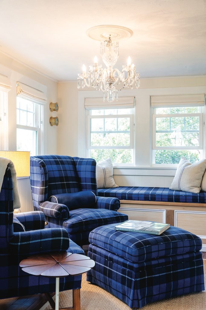Tess brought experience and taste to the task gained while working for Laura Ashley, Lord & Taylor and other high-end fashion and home goods retailers. She decided on a milky/linen white for walls throughout, which she painted herself. Fabrics, where required, are printed in bright navy blue.