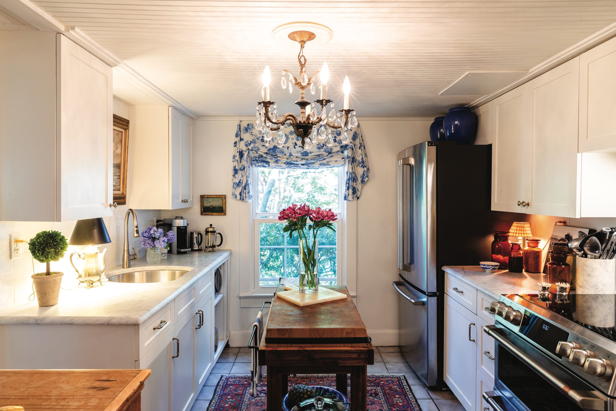 The kitchen, visible from the sitting room, is a slim galley with country French touches. Tess opened the space under the stairway to a second floor apartment (grandfathered as a rental) for a pantry displaying jars and baskets. The countertop is thick, heavy marble; the island, that dark, narrow wooden bench. The chandelier is weathered brass. Tess replaced the dishwasher with an oversized round metal sink, hearkening back to times she and her sisters would laugh, talk and do dishes together in their family home.