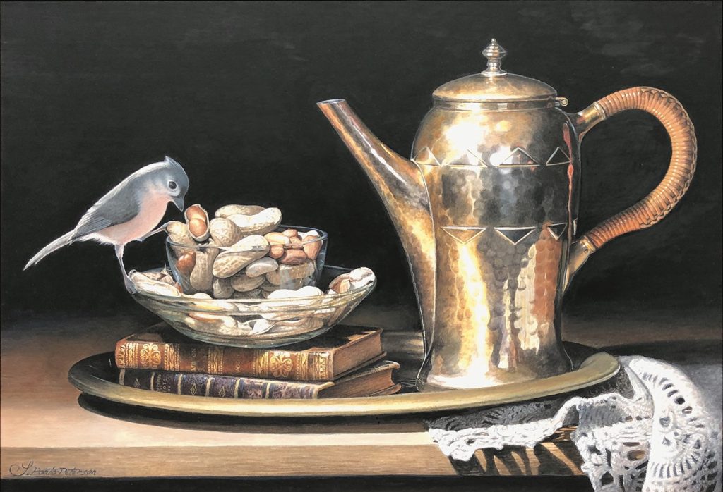 Every category has a first, second and third place award, each with a monetary prize, as well as an unlimited number of honorable mentions. Whether a piece wins or not, all the works hang throughout the Campbell House galleries, not necessarily by category but by what goes together, like, for example, a quiet set of blue florals entered by Paula Montgomery.