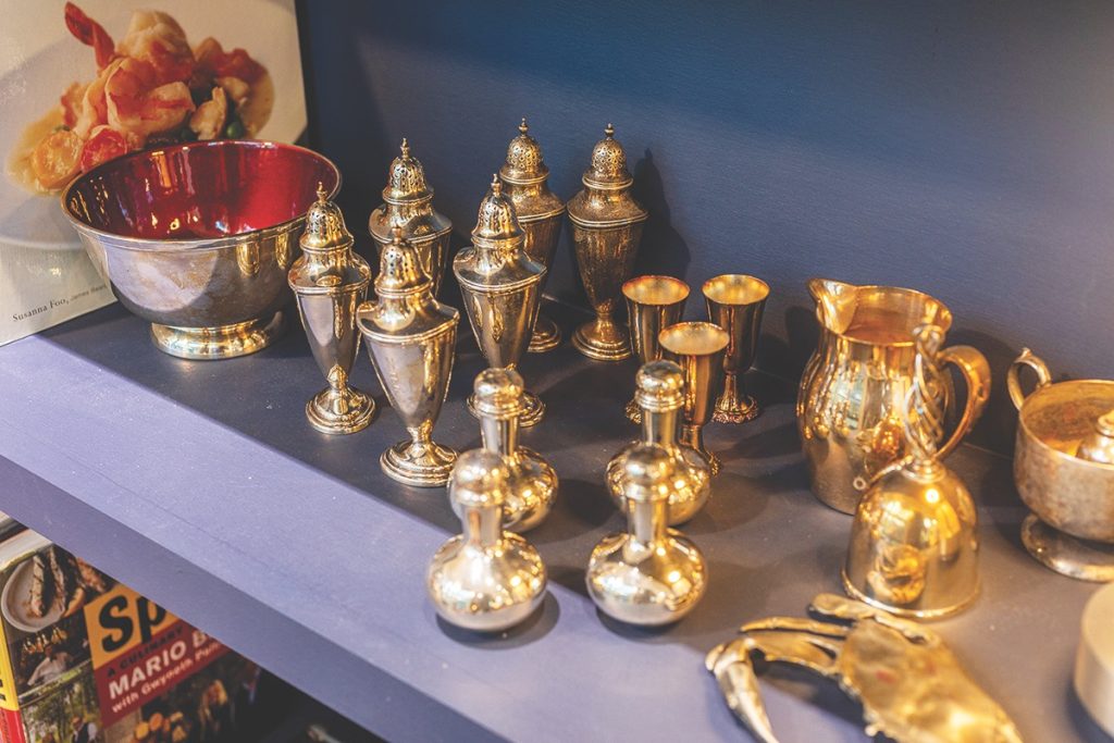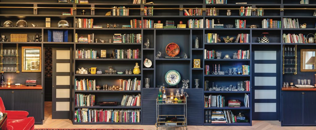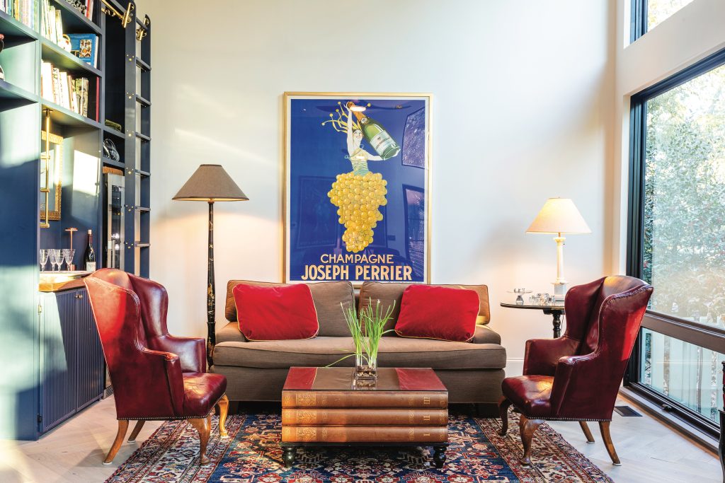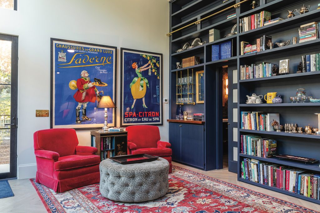 “They were advertisements and I was in advertising,” she says. “So vibrant, they make me happy.” Two red velveteen, 1940s-ish easy chairs from Barretts’ parents’ home, further the retro mood. What better setting for a dinner party, game night, business meeting, or book club?