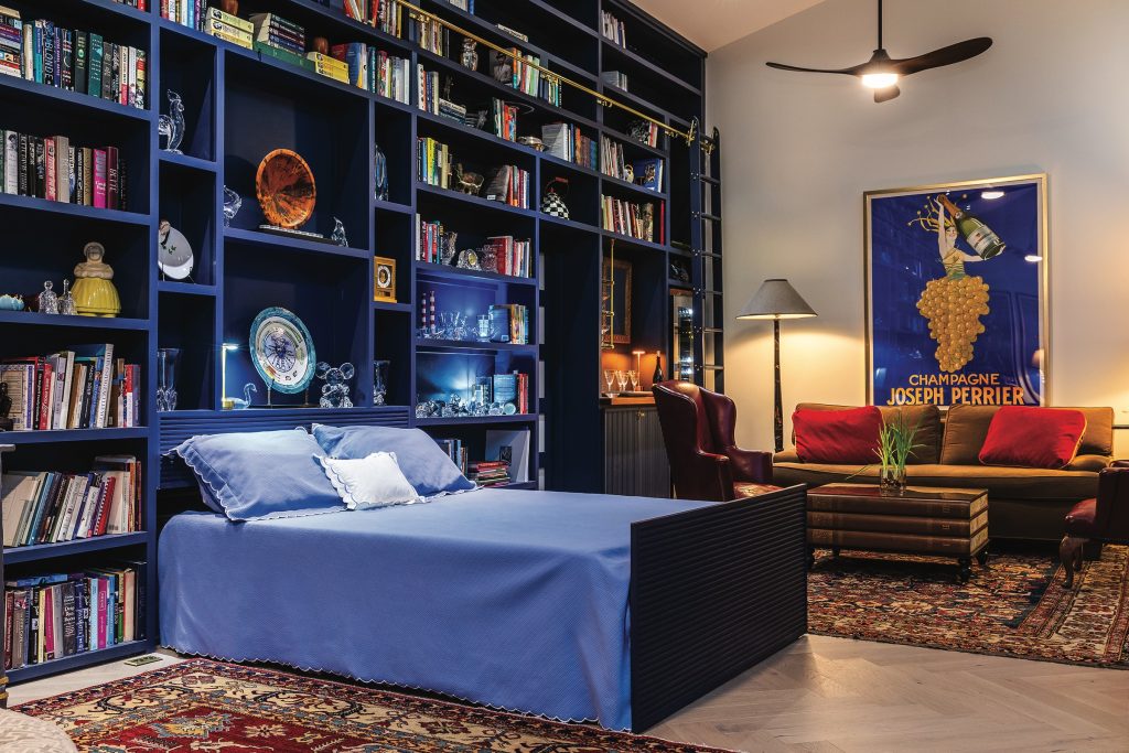 Its predominant color is a dusty navy blue — drawn from the blue, crimson and yellow in the area rugs — that offers a striking background for oversized French wine posters, some liberated on their travels, and adored by Barrett.