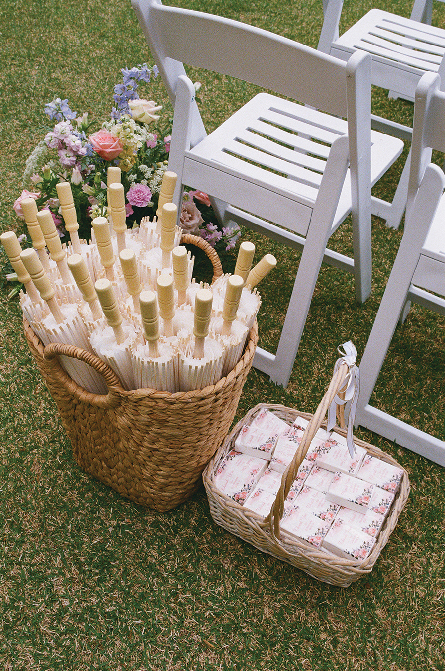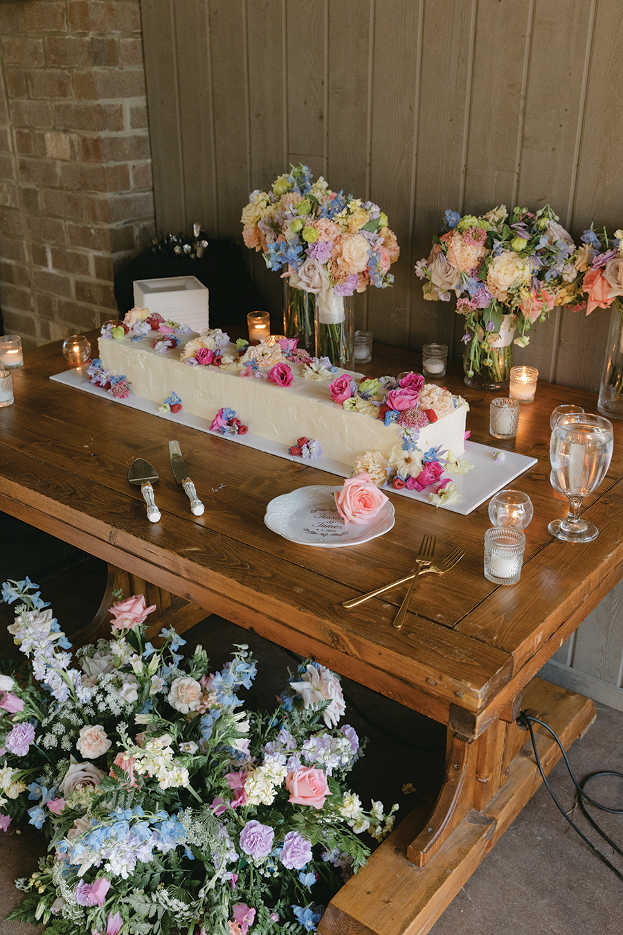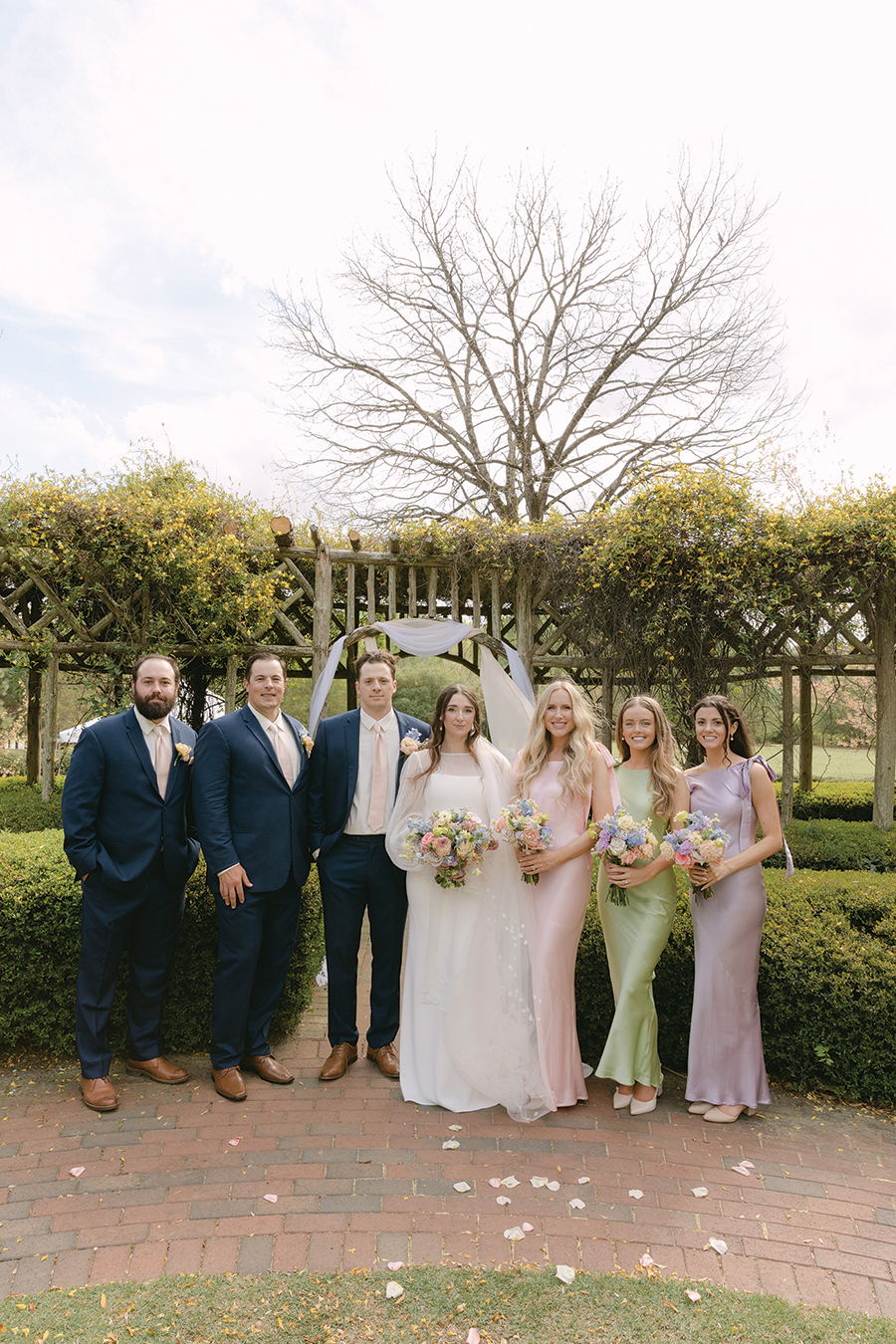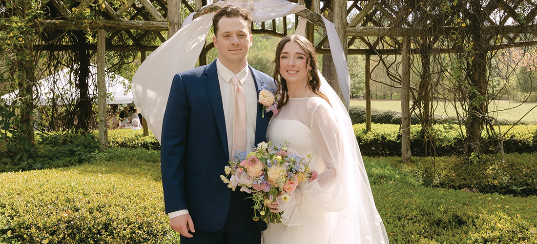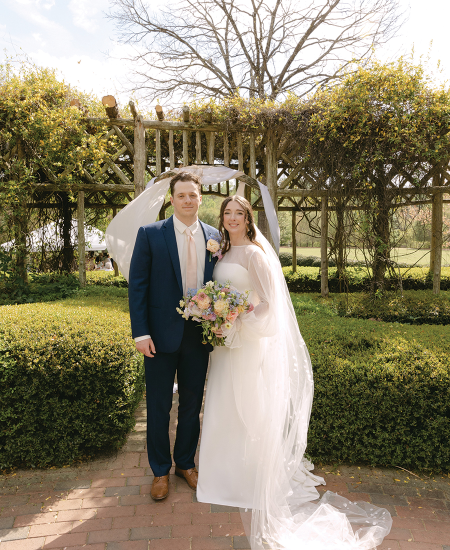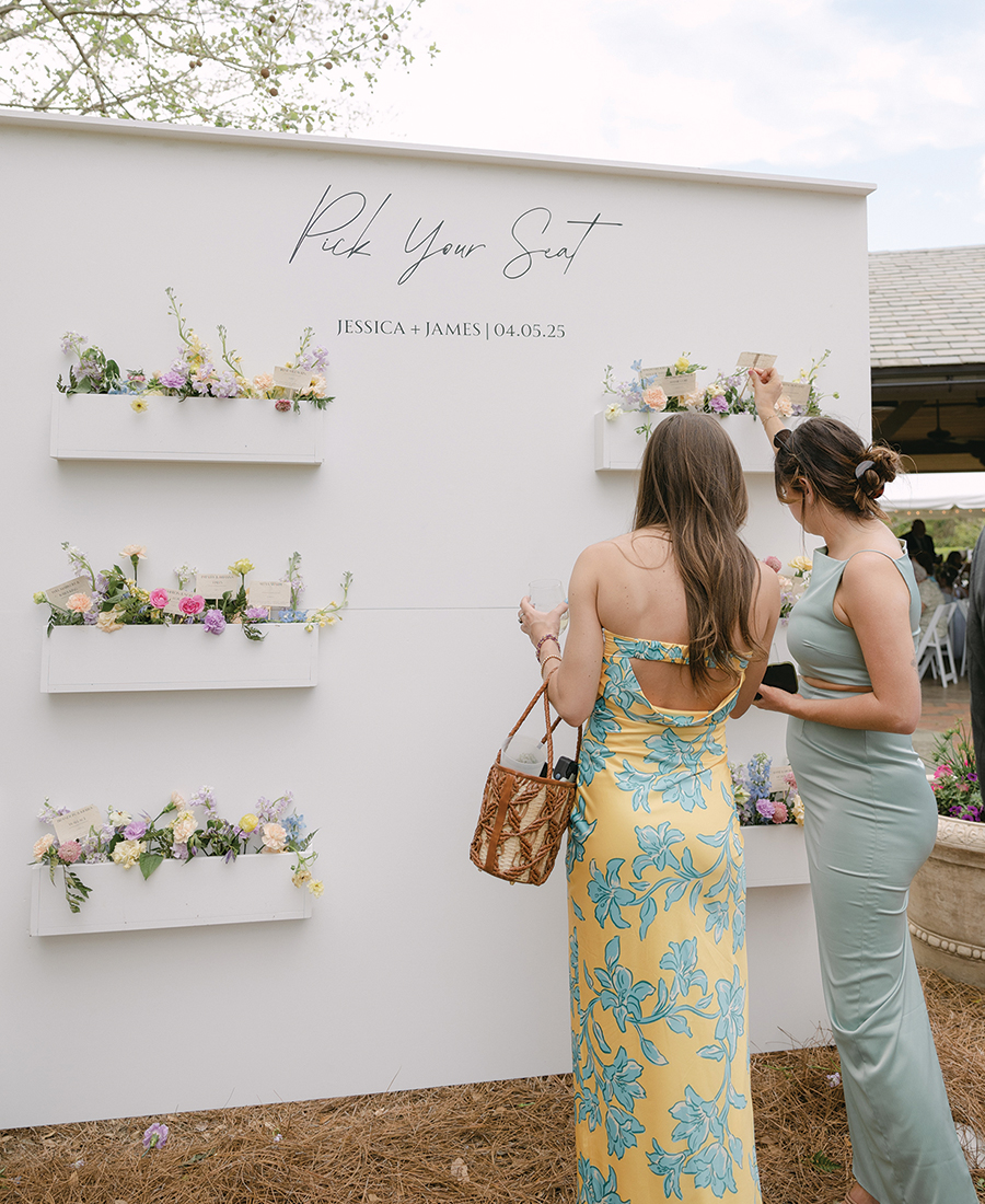 The Nobles got married on Apr. 5, 2025. They accentuated the season with a spring garden theme, incorporating loads of florals and pops of pink and green. Jessica’s dad even built a planter box that served as the couple’s seating chart. Bubbly & Bright Event Design Co. filled the box with fresh blooms, and Jessica designed escort cards on wildflower seed paper that guests could take home and plant. The couple also paid tribute to Pinehurst, gifting hats with embroidery that read, “Noble Golf Links — EST 2025.”