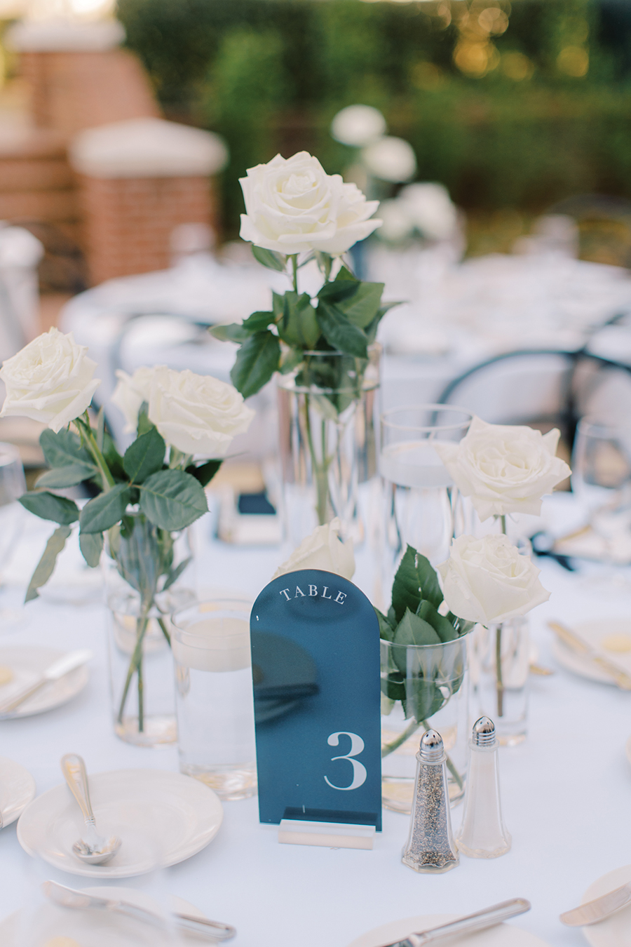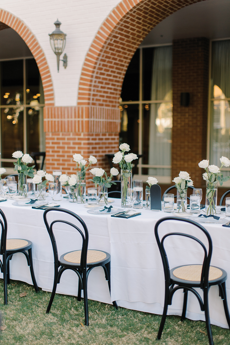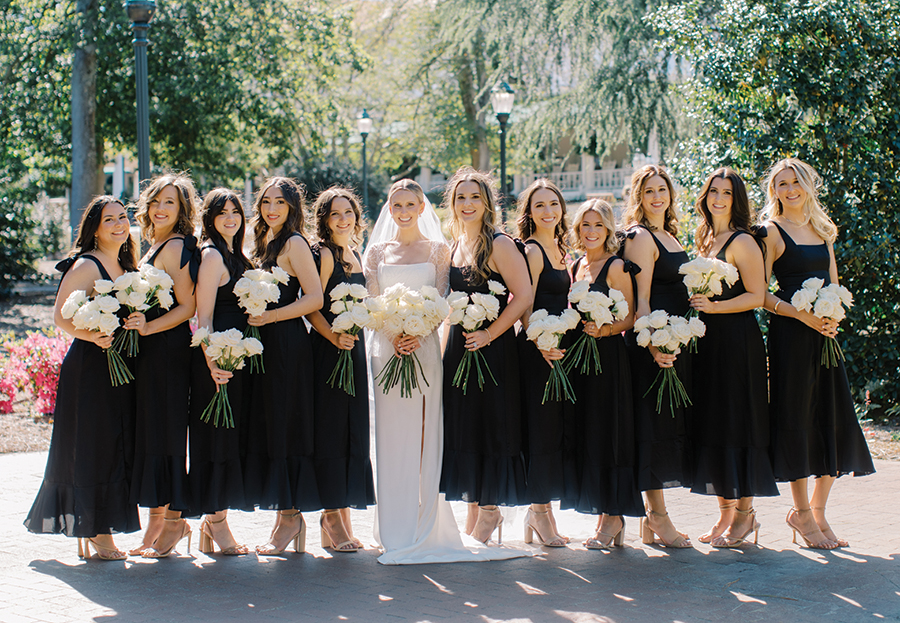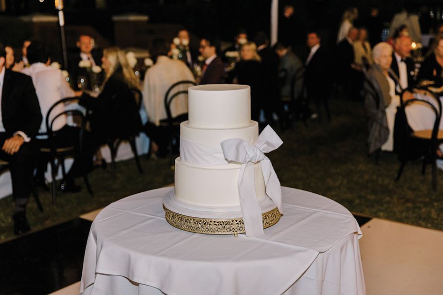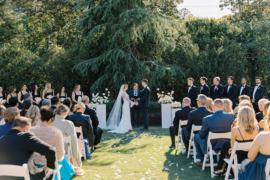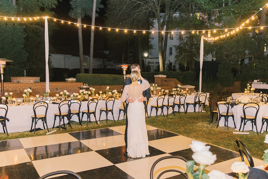 The lush outdoor venue looked timeless with classic black-and-white details, including black tuxedos and dresses for the wedding party; white flowers, linens and a cake; plus, a checkerboard dance floor that the bride and groom just didn’t want to leave.
