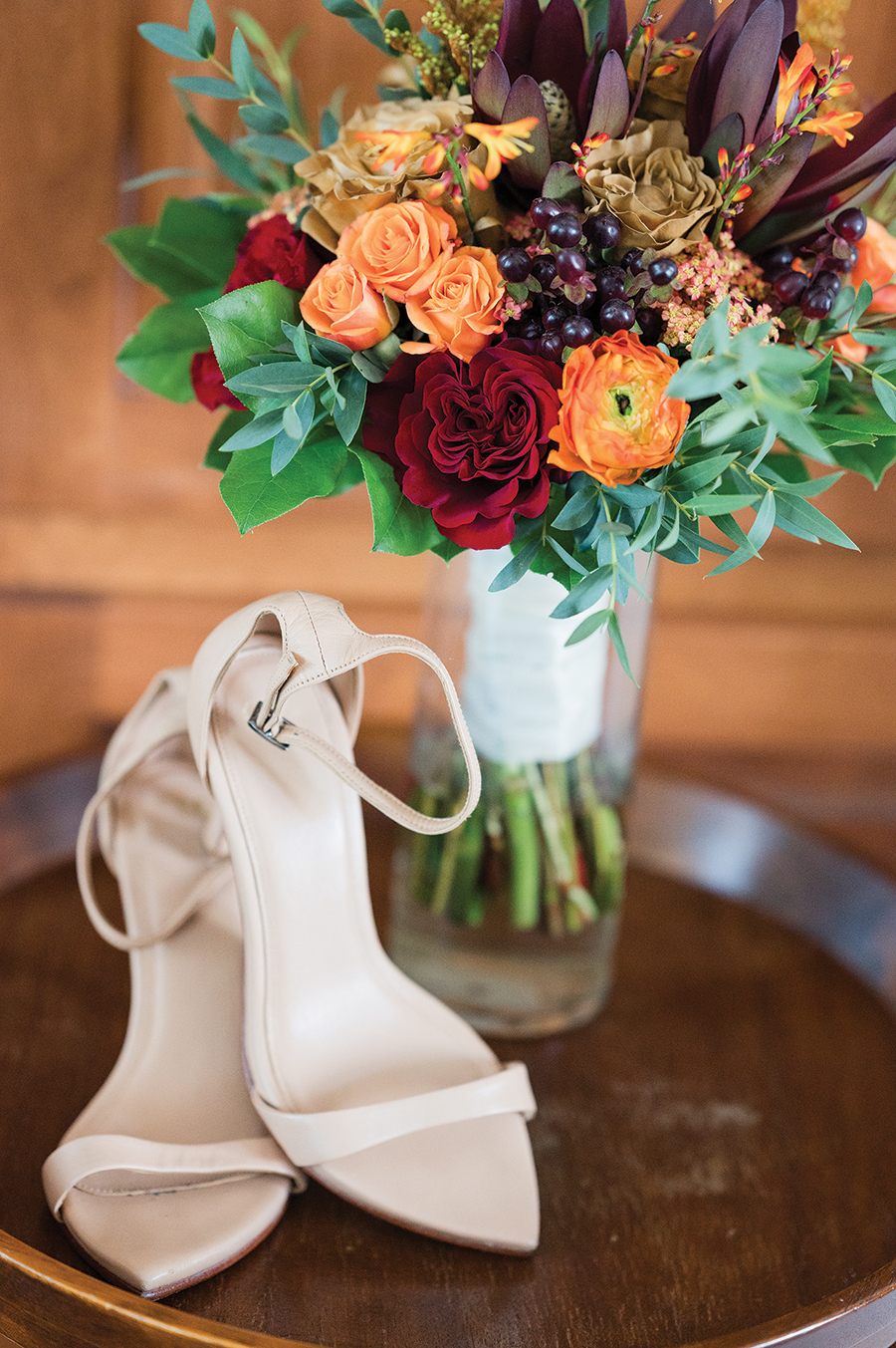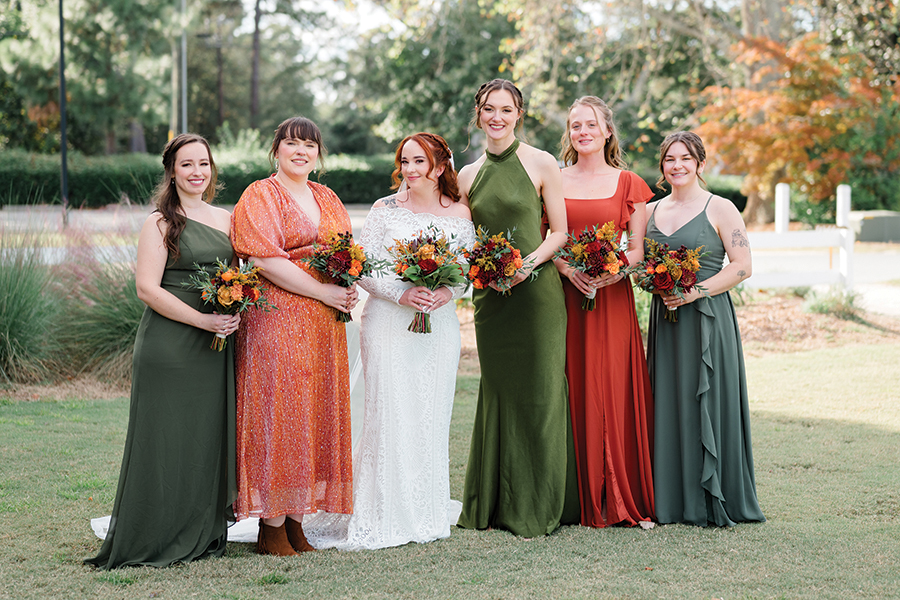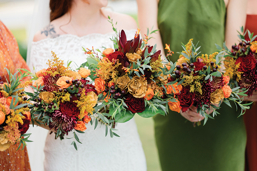 The couple exchanged “I dos” in the Fair Barn. Decorations of burnt orange and shades of green complemented the autumn season. “I wanted to be a fairy princess in the fall,” Rachel says.